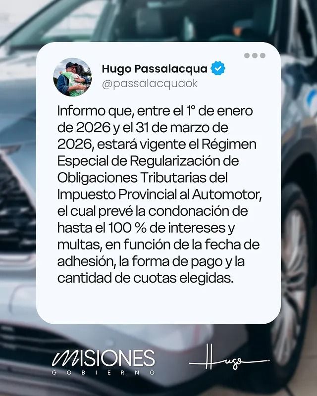 El gobernador de Misiones, Hugo Passalacqua, anunció este lunes la implementación de una nueva medida de alivio fiscal destinada a los contribuyentes de la provincia. A través de sus redes sociales, el mandatario confirmó que, “entre el 1° de enero de 2026 y el 31 de marzo de 2026, estará vigente el Régimen Especial de Regularización de Obligaciones Tributarias del Impuesto Provincial al Automotor”.