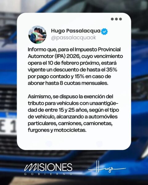 El gobernador de Misiones, Hugo Passalacqua, informó a través de sus redes sociales que, para el Impuesto Provincial Automotor (IPA) 2026, cuyo vencimiento opera el próximo 10 de febrero, estará vigente un descuento de hasta el 35% por pago contado y del 15% en caso de abonar el tributo en hasta ocho cuotas mensuales.