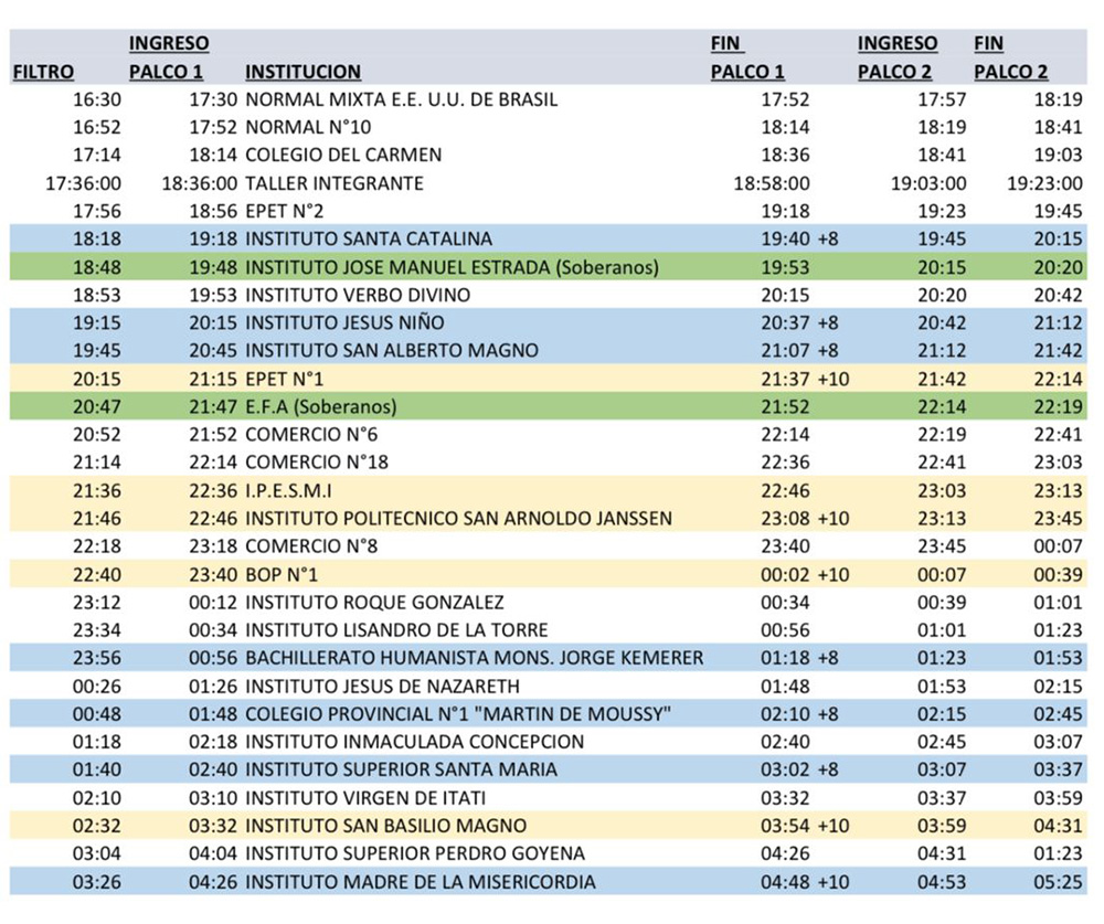 Los encargados de abrir esta nueva noche de calle serán los chicos de la Normal Mixta EEUU del Brasil, a partir de las 17.30, mientras que Instituto Madre de la Misericordia será el encargado de cerrar el show a a las 4.26.