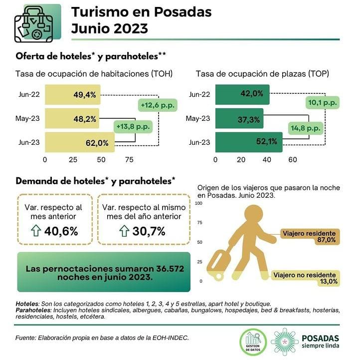 El informe subraya que la información analizada abarca el periodo de junio a julio de 2023, utilizando como fuente principal la Encuesta de Ocupación Hotelera elaborada por el INDEC. Dado que los datos más recientes disponibles corresponden al mes de junio para la ocupación hotelera y al mes de julio para los movimientos aéreos y la cantidad de pasajeros, este rango temporal proporciona una imagen actualizada y representativa de la dinámica turística en la ciudad de Posadas.