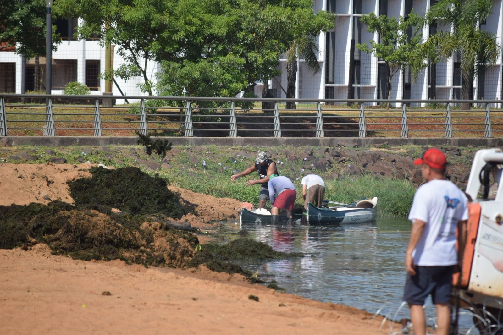 Equipos de trabajo de la Municipalidad de Posadas desarrollan acciones para liberar de algas a la zona cercana a la bahía El Brete. Recomiendan que ante cualquier coloración inusual y malos olores a la orilla se debe evitar el contacto con el agua.