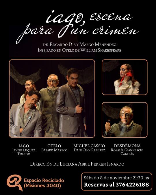 Presenta personajes sometidos a reencarnar los fragmentos de los hechos con los que Iago, convenientemente a través de maquinaciones, los indujo a sellar sus destinos. ¿Un estrado o una isla? Chipre: la envidia, la traición de la sangre, de la amistad y la pérdida del amor. Una escena casi perfecta para quedar impune… Casi…