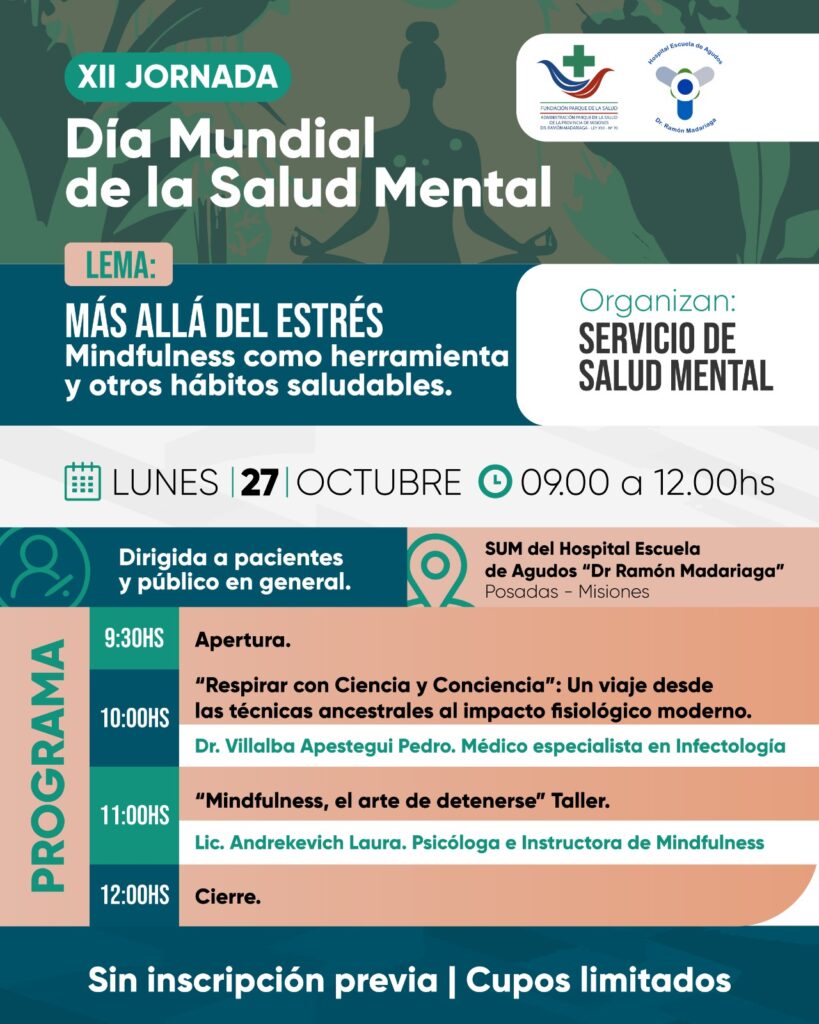 Con el objetivo de fortalecer las acciones destinadas al abordaje integral de la salud mental, el Hospital Escuela de Agudos “Dr. Ramón Madariaga” llevará adelante la jornada–taller “Más allá del estrés: el Mindfulness como herramienta y otros hábitos saludables”.