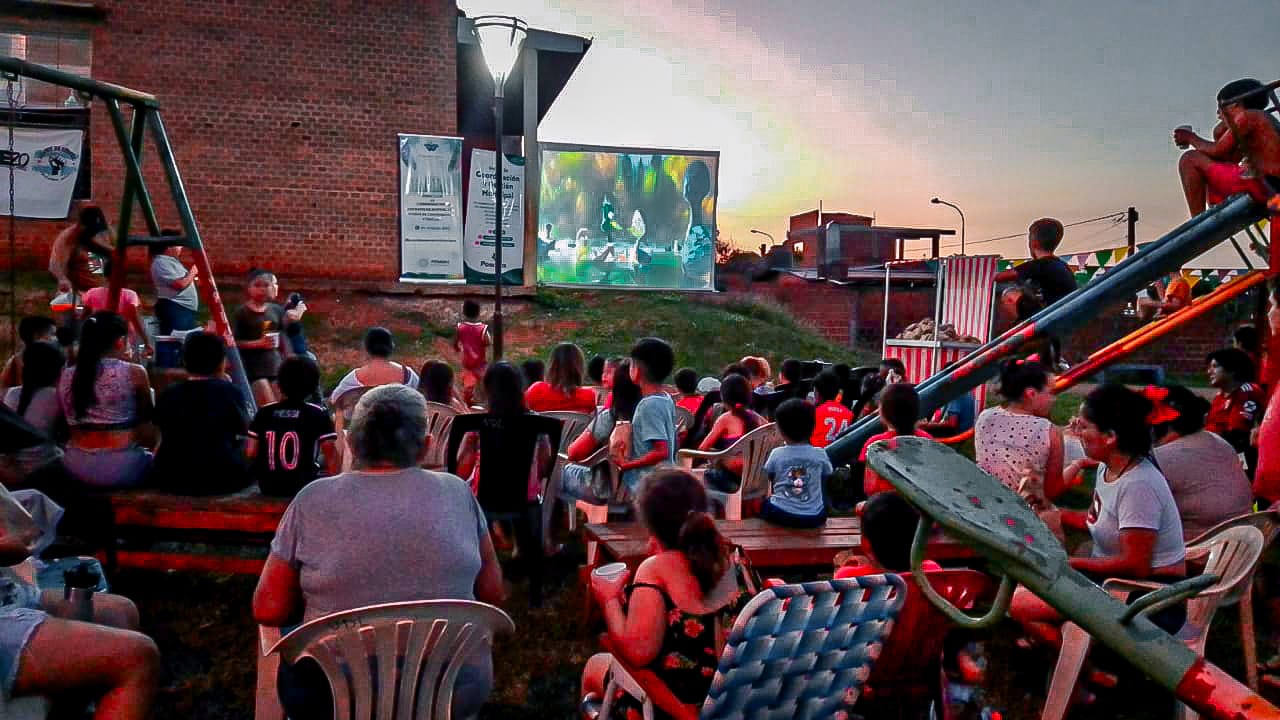 El intenso calor de la jornada obligó a cambiar los planes originales y montar la sala de proyección al aire libre, en el patio del SUM, donde las infancias, padres y vecinos se ubicaron de mejor manera para disfrutar de una hermosa película.