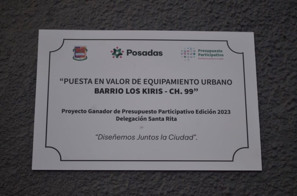 El acto de inauguración se centró en la firma del acta de entrega de la obra, correspondiente al proyecto ganador del Presupuesto Participativo 2023, denominado “Puesta en Valor de Equipamiento Urbano – Barrio Los Kiris – Chacra 99”, gestionado por la Delegación Municipal Santa Rita. La plaza se encuentra ubicada estratégicamente entre las calles 105, 100 y 103.